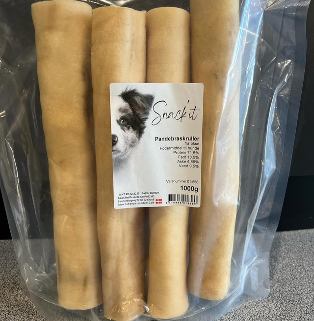 Pandebraskrullerne er lavet af 100% oksekød. Rullerne er robuste, hvilket gør det mere udfordrende for hundene at spise dem på én gang! Klinikken har testet rullerne på flere af deres egne hunde, blandt andet en Labrador og en Schæfer. Ingen af hundene har endnu formået at tygge sig igennem en hel rulle, hvilket indikerer, at rullen kan holde til flere omgange.