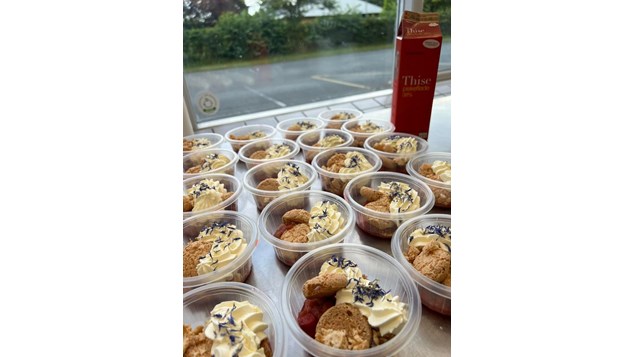 Vores produktion er tilberedt med lokale råvarer. Rabarber fra Søren/ Smollerup, rabarbersirup fra Karen/ Staarup Haandbryg og ja, Danmarks bedste fløde fra Thise Mejeri