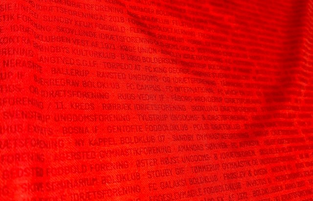 På indersiden af trøjen er navnene på samtlige 1535 fodboldklubber under Dansk Boldspil-Union skrevet.