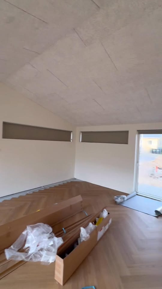 Familien er i fuld gang med de sidste detaljer inden indflytning – og vi er glade for at have bidraget med både gardiner og det smukke sildebensgulv fra Parador, som virkelig sætter prikken over i’et i deres nye hjem.